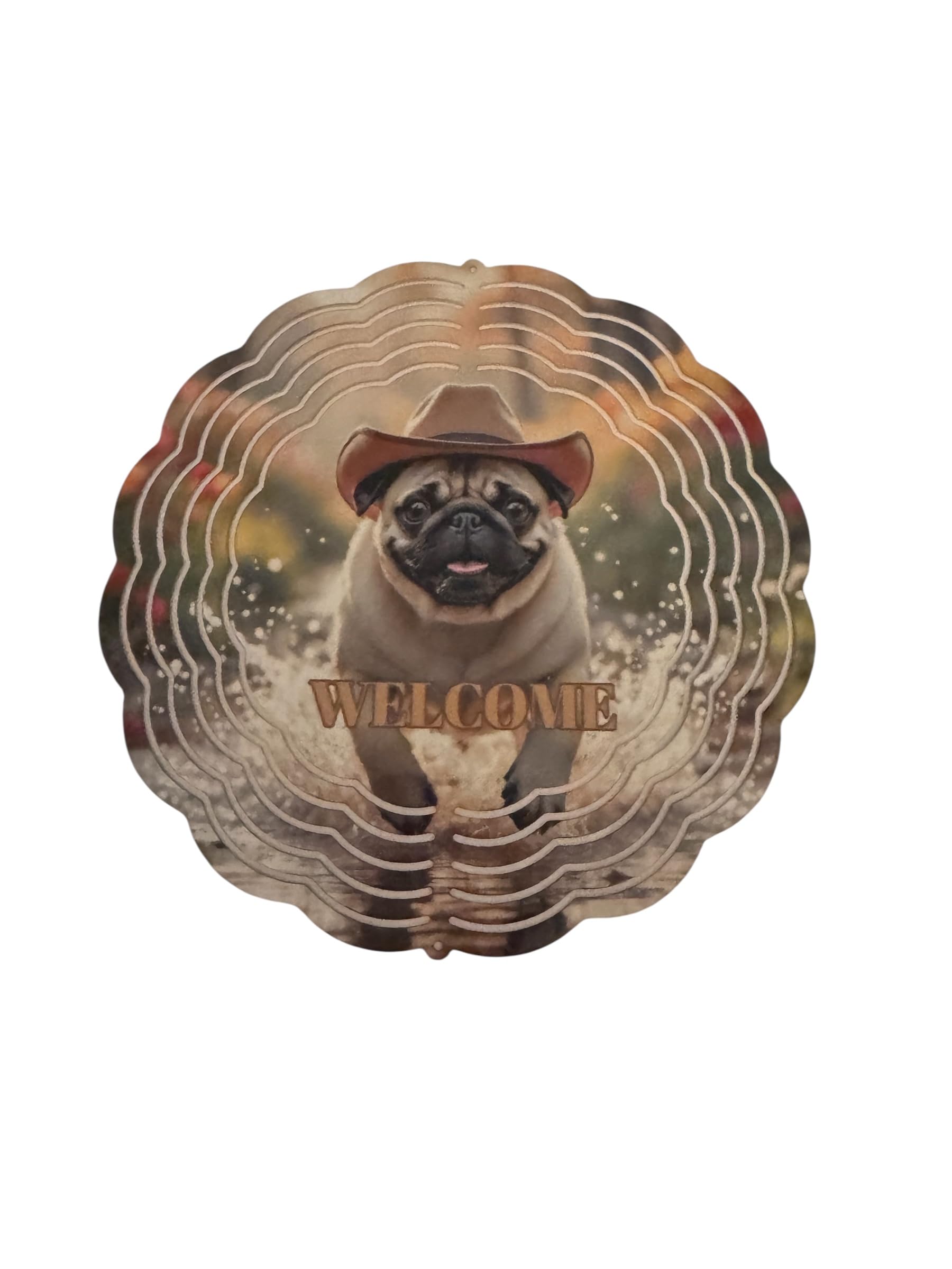 - DECORATIVE DESIGN: Unique wind spinner featuring a charming pug in a cowboy hat with 'WELCOME' text, perfect for outdoor garden decor